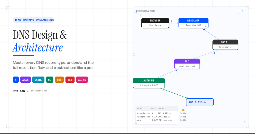 DNS Design & Architecture — The Complete Guide | InfoTechTu 01 Overview & Summary DNS (Domain Name System) is the backbone of the internet — it translates human-readable domain names like www.google.com into machine-readable IP addresses like 8.8.8.8. But DNS design and architecture goes far beyond simple name-to-IP resolution. This guide covers all major DNS […]